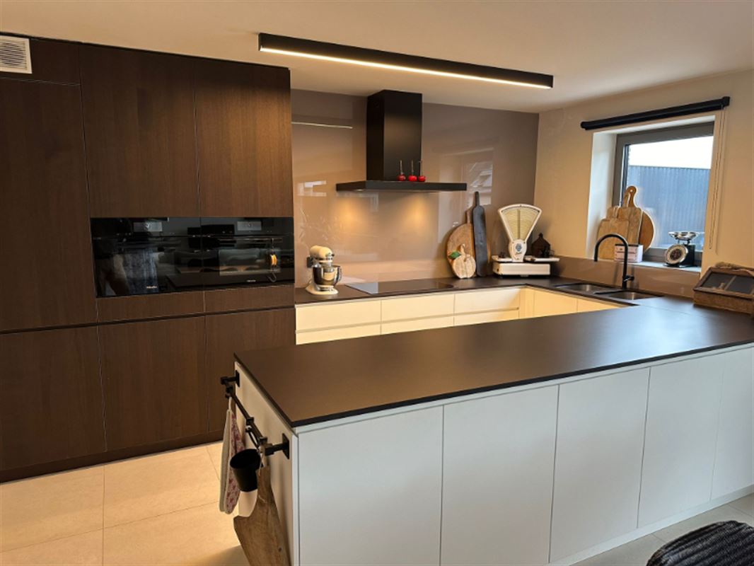 Via de inkomhal betreedt u de lichtrijke woonkamer, die naadloos overgaat in een hoogwaardige open keuken met Miele-toestellen.