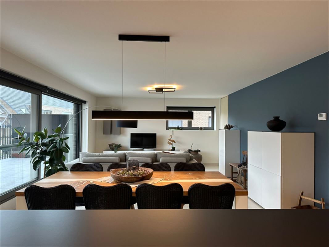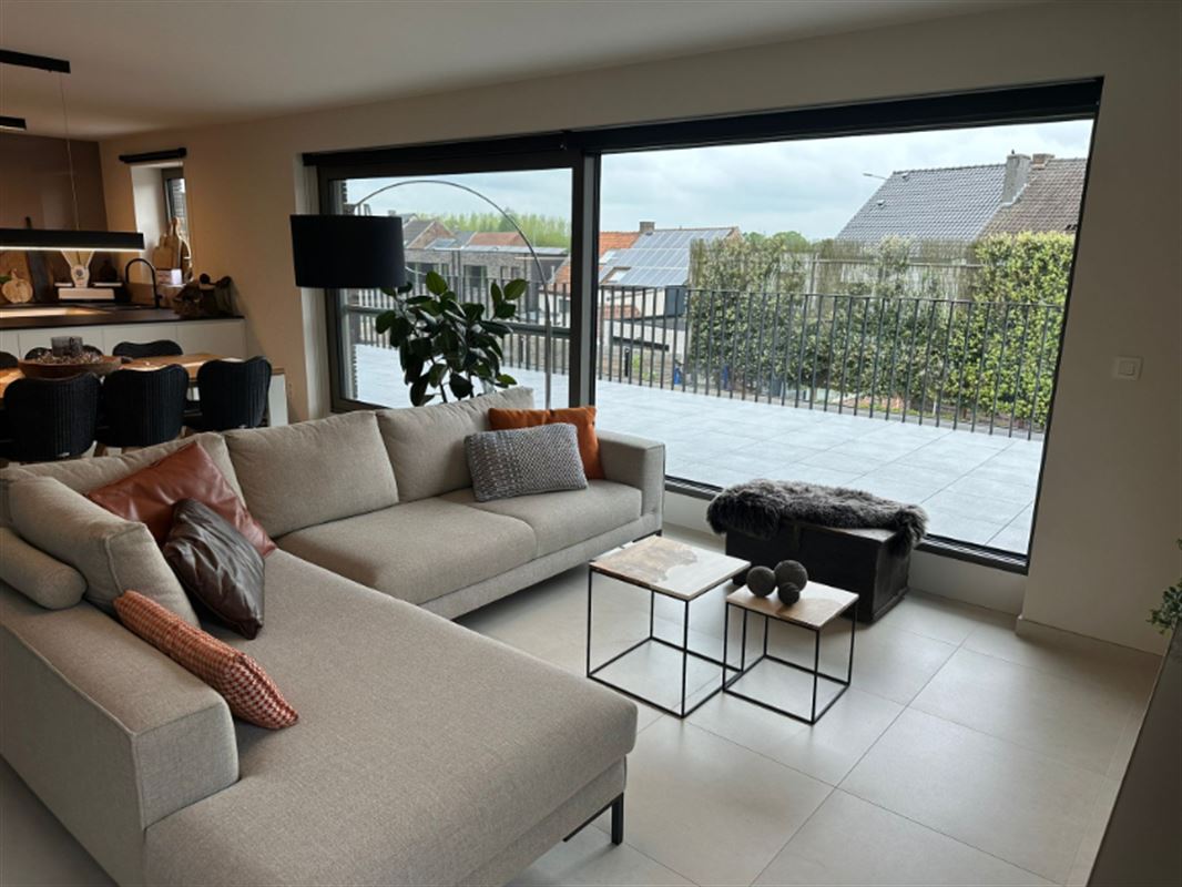 De woonkamer geeft uit op een ruim terras, ideaal om te genieten van de buitenlucht.