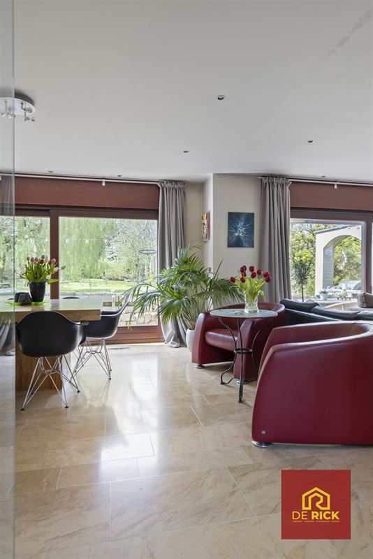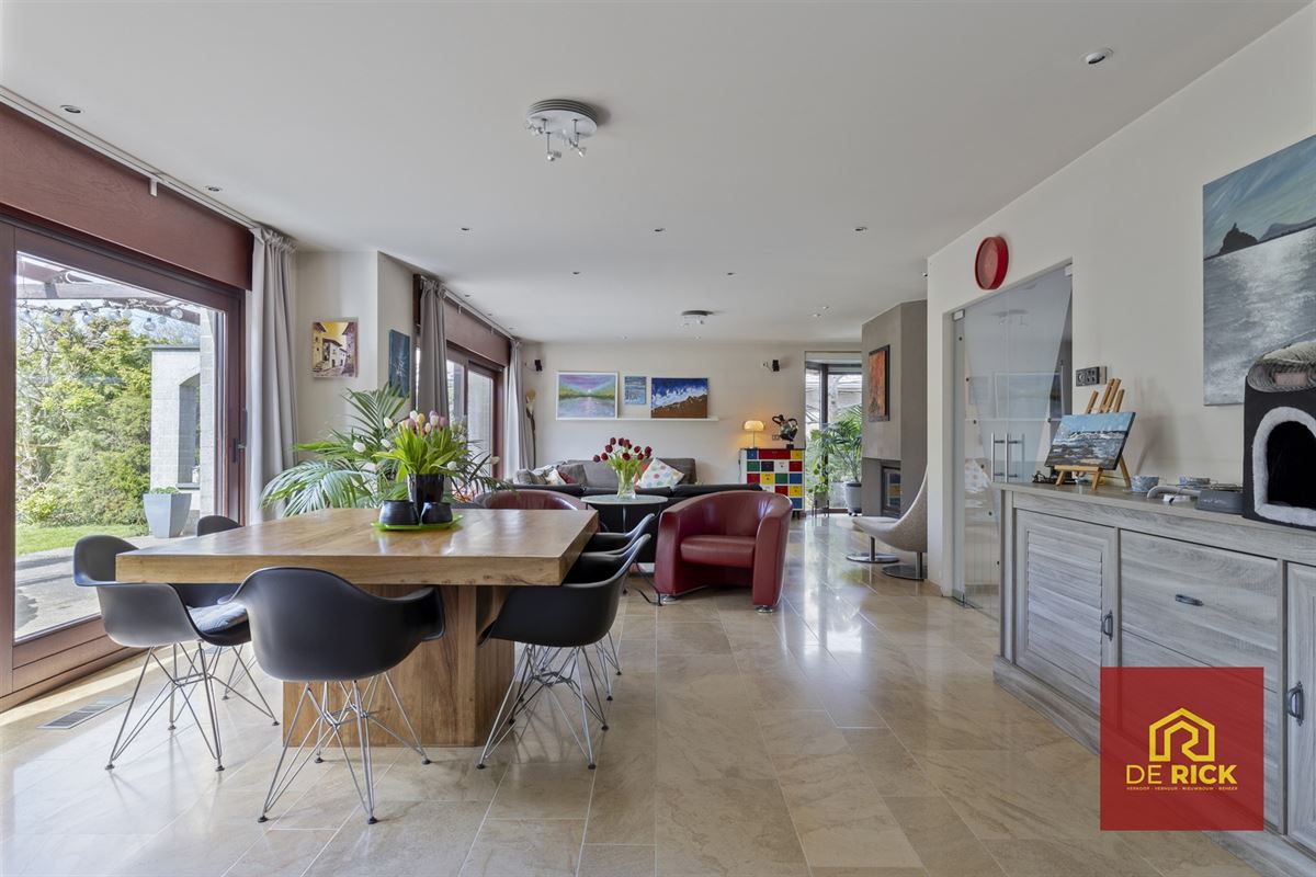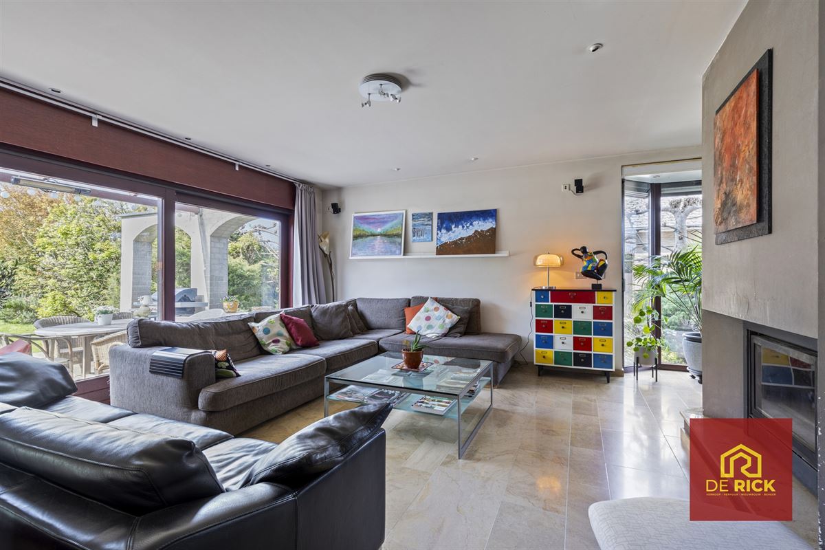 Via de inkomhal kom je in de aangename living met aparte haardhoek. Grote schuiframen bieden een prachtig zicht op een natuurlijke tuin.