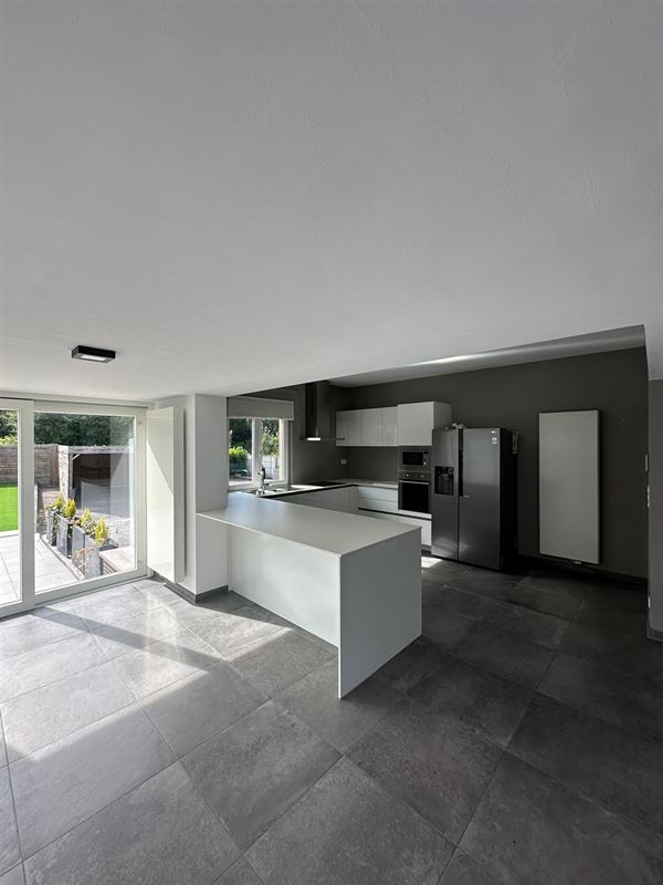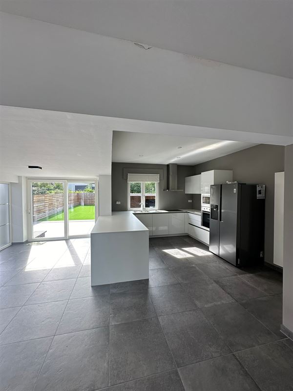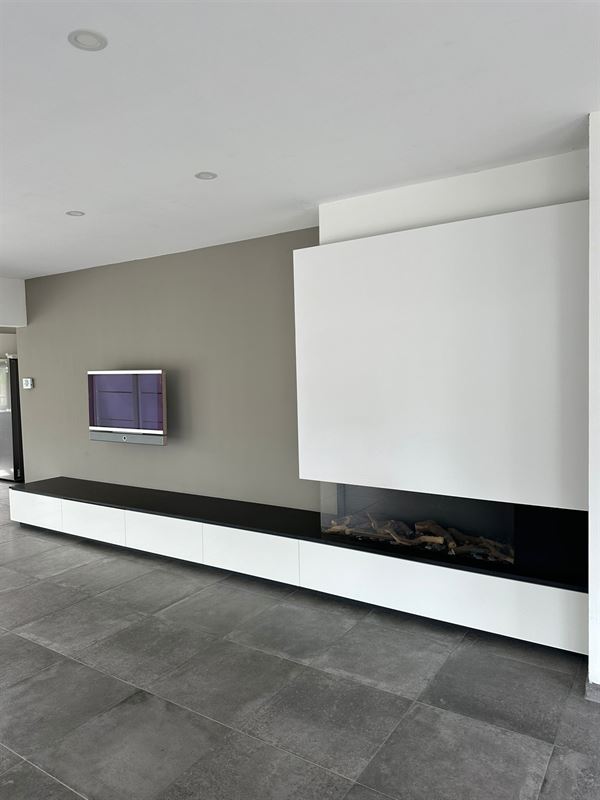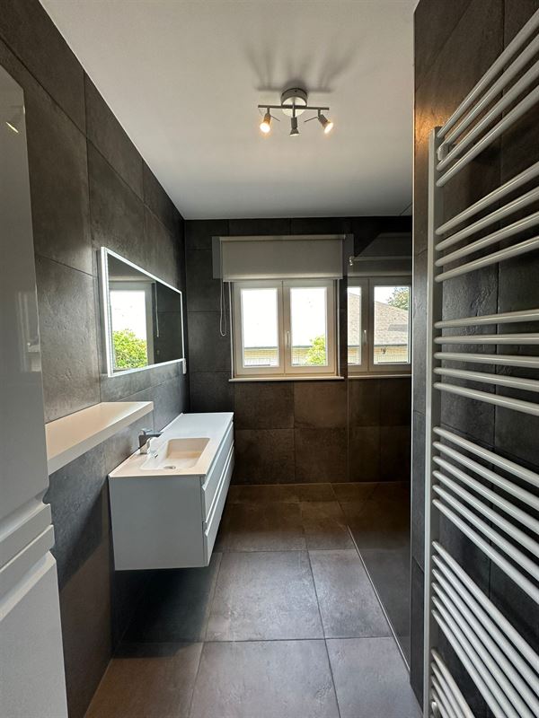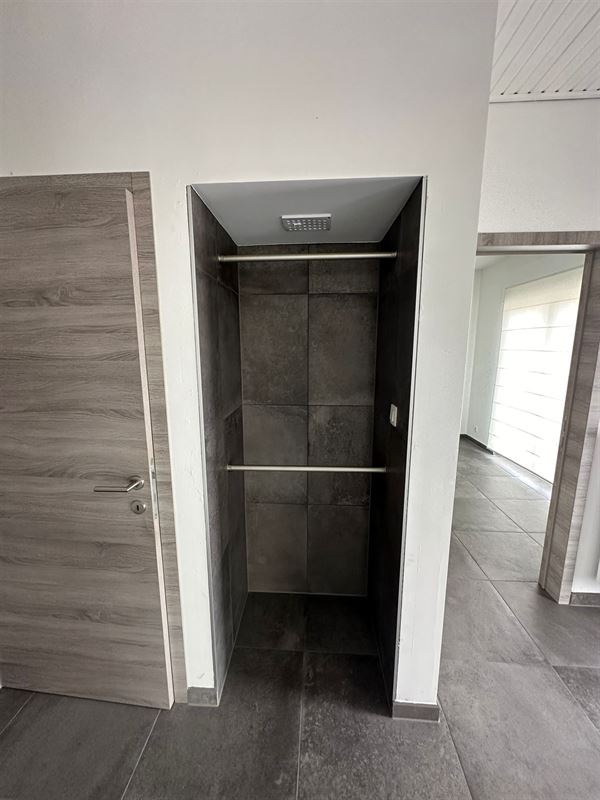 De woning, die geniet van veel natuurlijk licht, biedt een ruime inkomhal met plaats voor een vestiaire, een royale woonkamer met gashaard, een volledig uitgeruste open keuken met eetruimte, drie slaapkamers, een badkamer met inloopdouche, en een apart toilet met lavabo. Overal in de woning zijn rolgordijnen of rolluiken geïnstalleerd voor extra comfort en privacy.